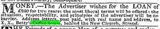 ‘the said John Backler had shortly previous to the dissolution of the said partnership became embarrassed in his circumstances and had unknown to your Orator (as your Orator has lately discovered) published an Advertisement in the newspapers in the words following [see advert from The Times 1 September 1820] that is to say, “Money, the Advertiser wishes for the loan of Two hundred and fifty pounds for two years the most liberal terms will be offered the situation respectability and principles of the Advertiser will be no barrier, Address letters post paid with real name and address to X.X. Battys Coffee House behind the new church Strand” as by the said Advertisement will appear and your Orator sheweth that one George Chartres a man then in desperate circumstances answered the said advertisement …’ Chartres had in effect swindled Backler out of large sums of money, andthe fraudulent bills were passed to Frances Wills, who sought recompense from Mapleson.