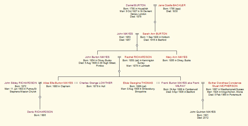 Jane Ozella Backler and Daniel Burton  had one child: Sarah Ann Burton, born 1 September 1828 and baptised at Fetter Lane Independent Chapel on 10 October 1828, the family being of the parish of St Andrews Holborn.  Sarah Ann Burton, or Sarah Ann Mayes as she would become, obligingly appears in every English census from 1851 to 1911. Frustratingly, I cannot locate her in the 1841 census, when her father appears with his new wife, but not with his daughter who would have appeared as aged 12 in that census.