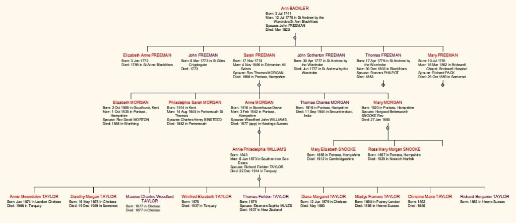 In which we see that Ann Backler and John Freeman had six children in all, three of whom married and had children. This post looks at the MORGAN descendants, from the marriage of Sarah Freeman (1774-1856) to Rev Thomas MORGAN (1771-1851). We meet, among others, the delightfully-named Rev Hargood Bettesworth Snooke…