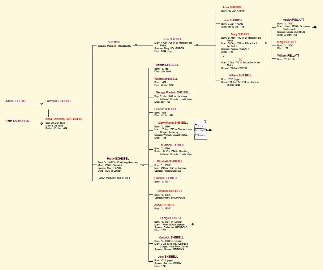 So far, so good, for Henry, but what about our John? The Pedigree shows him as Henry’s nephew, naturalised by Act of Parliament No. 94, 4 and 5 Anne (1706), as son of Mary Scheibel, father’s name not given. However, I have combed through the very many names of naturalised folk in this Act, and the one I find is ‘John Phillip Sheibell son of John Sheibell by his wife Mary born at Ffriedberg in Germany’. Is this ‘our’ John? I have reason to believe that it is, since John Phillip Sheibell was buried in 1734 at the Savoy Lutheran Chapel, and ‘our’ John (no Phillip in the name) died in that year, stating in his Will that he wished to be buried there. If this is so, and the Naturalisation parentage is accurate, ‘our’ John was indeed the nephew of Henry and the grandson of Hartmann. The trees below do not show his father as ‘John’, which I now believe to be the case.