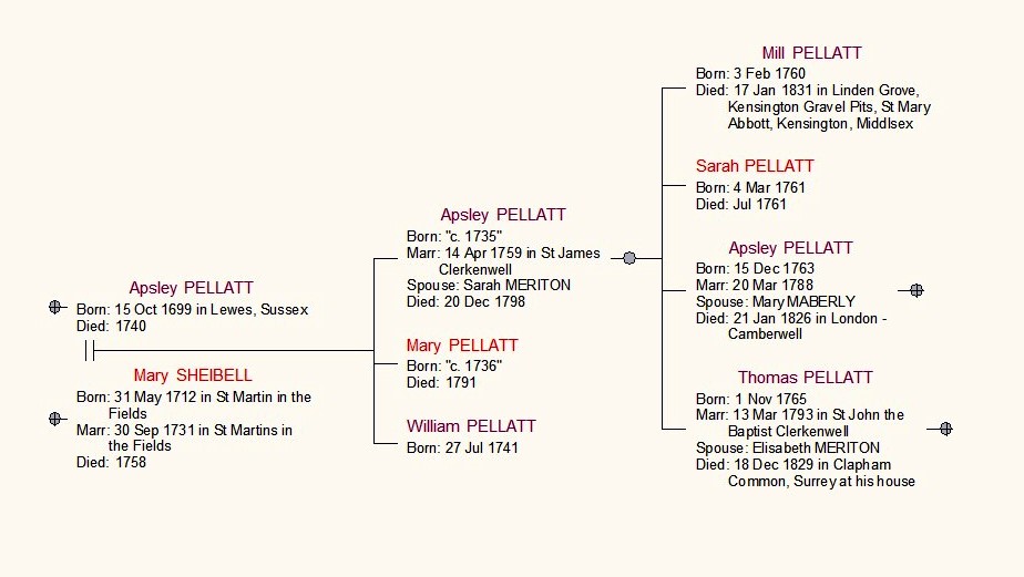 Given that Sarah predeceased her husband by a few days, the provisions in his Will for her were not applicable, so basically everything went to the three brothers, with Mill seeming to get a bit more than the two younger siblings. Of interest to us is that eldest grand daughter Mary Pellatt (1789-1857) was to receive £100 when reaching age 21 or day of marriage, a nice little sum for her when she married Samuel Backler (1784-1870) in 1810. In the next post we will catch up with Thomas Pellatt, then we will peruse the Meritons, and finally will move on to Apsley Pellatt III. Lots to look forward to!