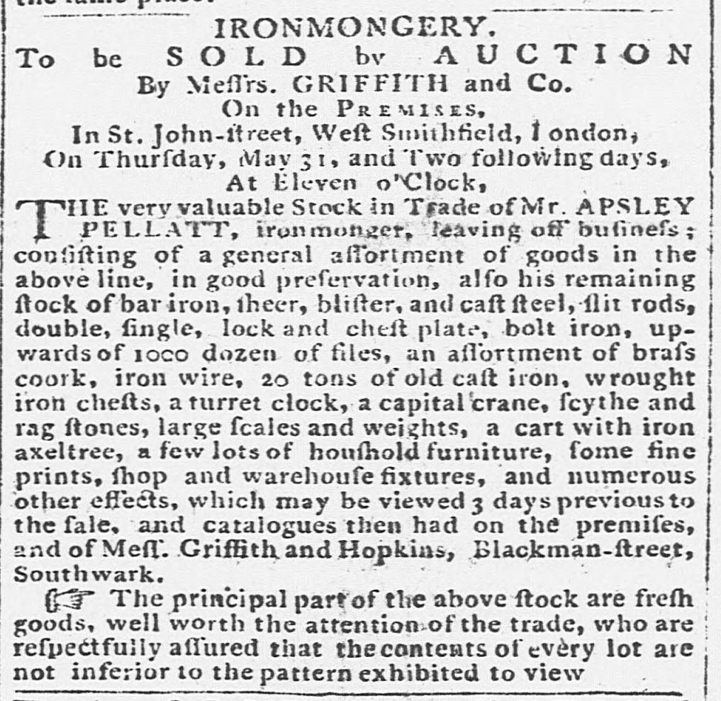More context of Apsley Pellatt’s working life is given in the advert seen below, not long before his death in 1798. Here we see the types of goods an ironmonger would stock – iron, steel, brass – plus household furniture and effects. Presumably the Pellatts were moving from St John’s Street to Islington, where they died within days of each other at the end of 1798.