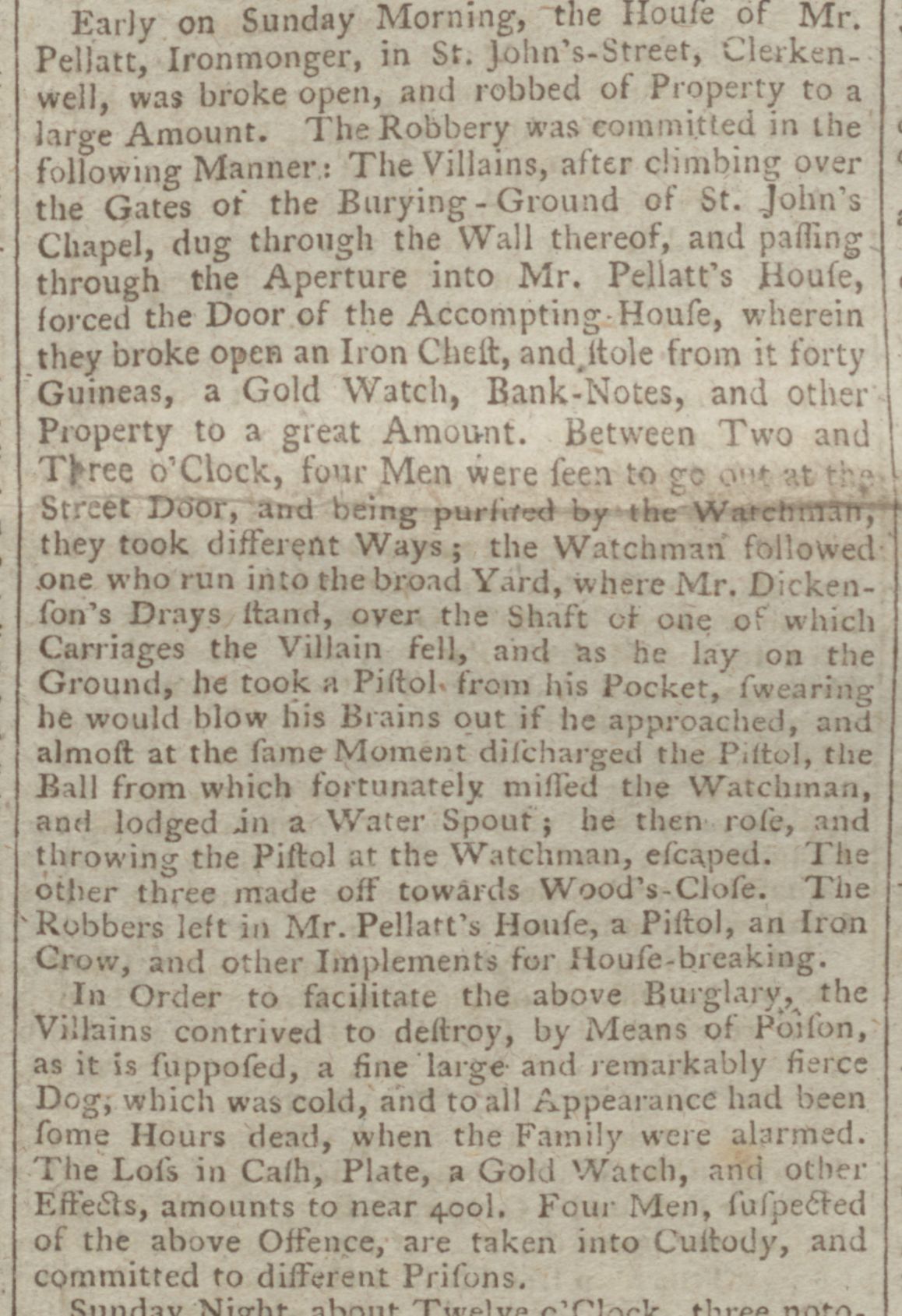 This clipping tells us a lot about Apsley Pellatt at the time. His home was adjacent to St John’s Chapel and the burying ground, both on the western side of St John’s Street as it heads north towards Islington. Not far away is St James Clerkenwell, where Apsley Pellatt II married Sarah Meriton. The value of stolen goods was some £400 – around £60-80,000 today, depending on which website you peruse. They owned a dog! I have not managed to find court reports about the suspected thieves.