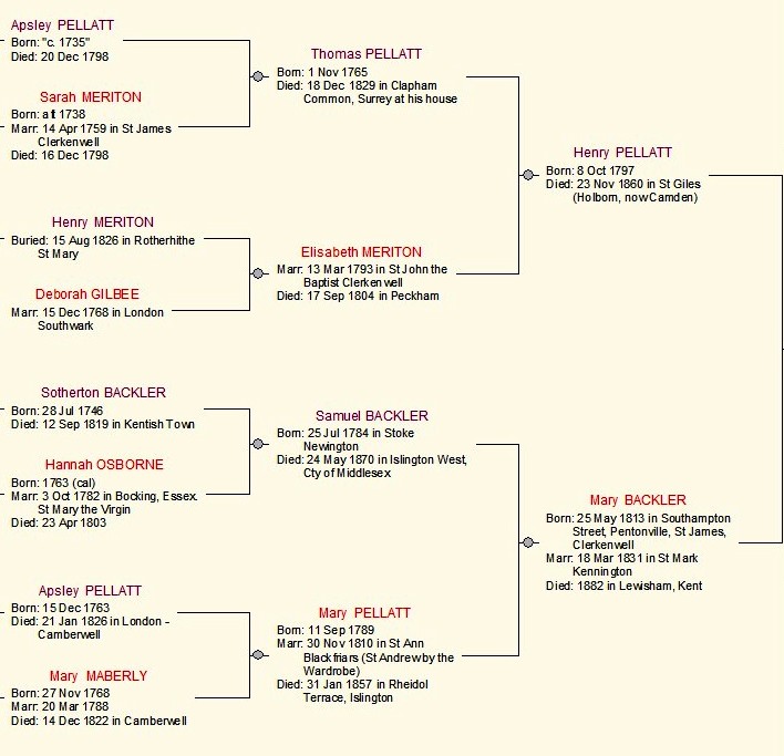 The diagram above shows two generations in one line, ie Apsley Pellatt II is at the top left, while his son Apsley Pellatt III is at the bottom left and is the brother of Thomas Pellatt, top middle row. Hopefully readers get the gist!