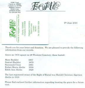 Death of Mary [Pellatt] Backler and burial at Highgate Cemetery. As seen in the address list above, Mary Backler died in 1857, and was buried on 7 February in what would become a family plot at Highgate Cemetery.  I have visited the site, which is in a wooded area, with no stones visible.  Samuel would be buried there in 1870, along with their daughter (my 2x great grandmother Susanna [Backler] Boulding Cross – more of her in a later post) – and some others.