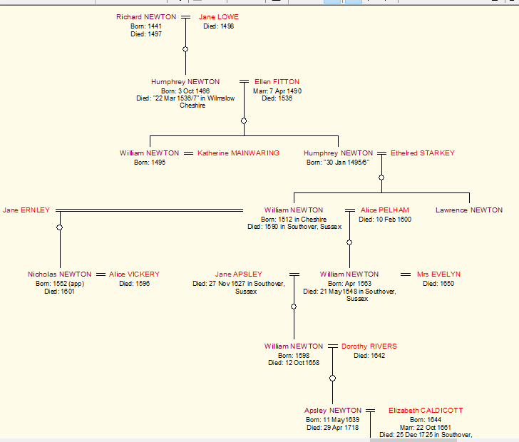 We can then trace further back in the Newton line, to my 14x Gt. Grandfather, Humphrey Newton (1466-1536).  This diagram introduces us to the name of ‘Apsley’, first seen with Apsley Newton (1639-1718), and further back as the surname of Jane Apsley ( – 1627), who was married to William Newton (1563-1648), they being my 11x Gt. Grandparents. The name Apsley distinguishes successive generations of Apsley Pellatts.  (When this name is correctly transcribed, it makes searching this line relatively easy.)